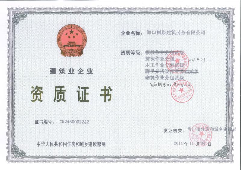 海口樹泉建筑勞務(wù)有限公司成立于2011年,公司位于海口,其前身是一家專業(yè)建筑施工隊(duì),自2004年即開始在海南從事建筑勞務(wù)施工。自成立至今,公司已經(jīng)擁有一支科學(xué)管理、質(zhì)量過硬、能打硬仗,搶工期的專業(yè)隊(duì)伍。能獨(dú)立承擔(dān)大中型工業(yè)與民用建筑 、室內(nèi)外裝修、各類機(jī)電設(shè)備安裝工程。代表工程有海口濱海華庭、三亞時(shí)代海岸T01/02/04/05棟高層、合肥東海花園二期、陵水富力灣B區(qū)高層、三亞金中海(酒店)、瓊海大印經(jīng)典花園、海口環(huán)球海景大酒店(四星級酒店,在建中)、陵水珍珠大廈(五星酒店)、海口萬達(dá)廣場、美蘭機(jī)場二期。